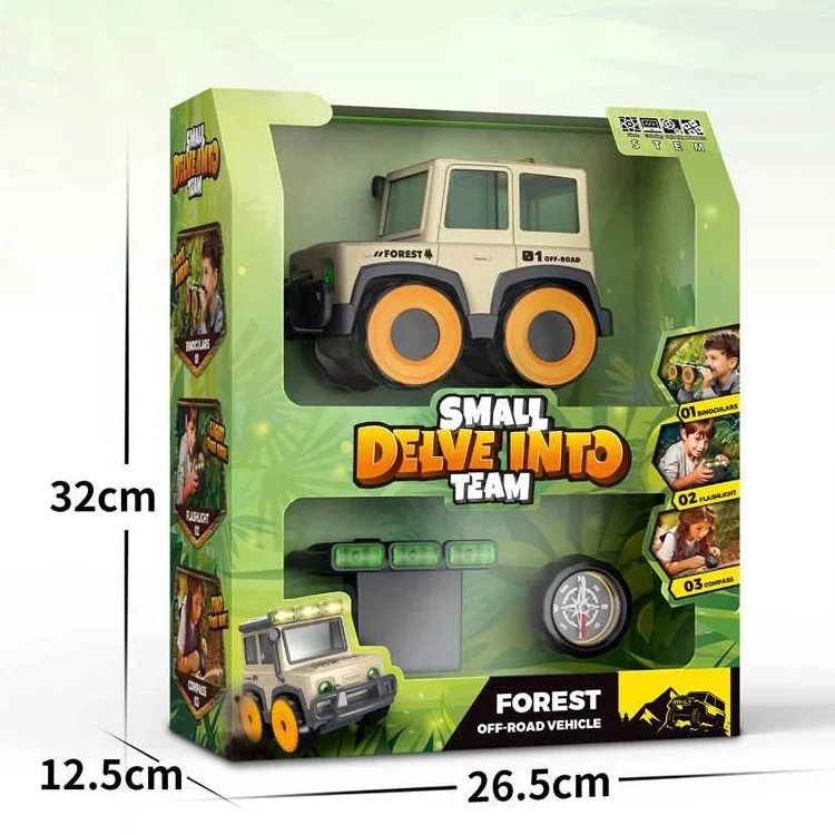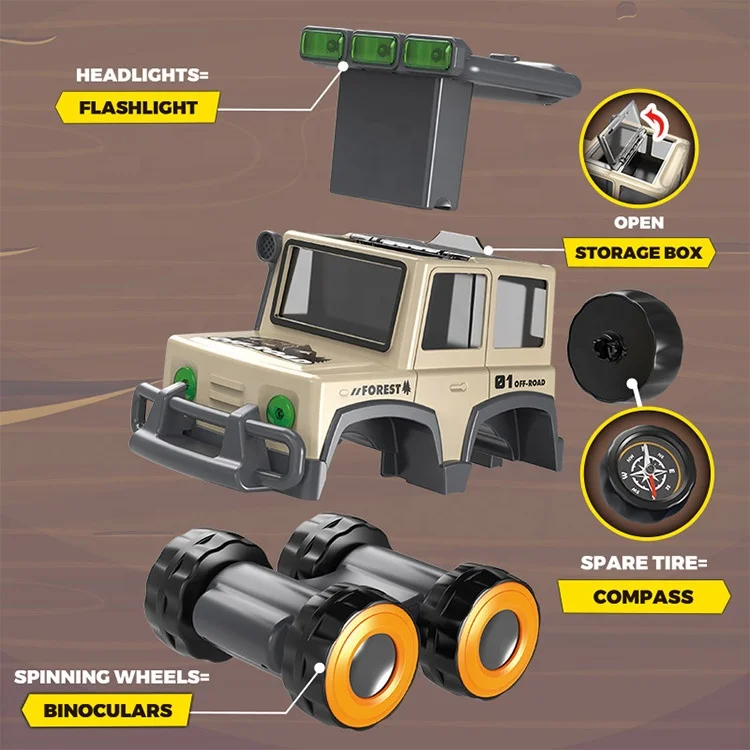 ITTL 4 in 1 Durable Plastic STEM Car Toy Vehicle Big Adventures with Binocular Flashlight Compass Friction Features
